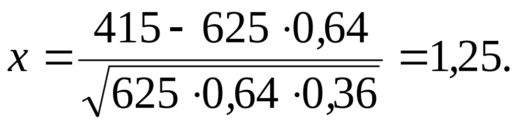 Так как функция φ(х)–четная, то φ(-х)=φ(х). По условию задачи n=625, m=415, р=0,64. Находим q=1–0,64=0,36. Определяем значение x: