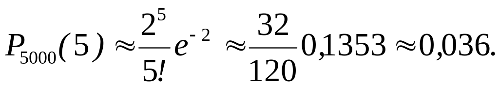 При этом чем больше число п и меньше число р, тем точнее результат по этой формуле. По условию задачи n = 5000, m = 5, р = 0,0004. Тогда λ = 5000·0,0004 = 2. Применяя (3), получим