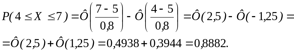 По таб. 2 находим Ф( 1,25) = 0,3944; Ф(–2,5) = –Ф(2,5)= = – 0,4938. Подставив эти значения в (5), получим искомую вероятность: