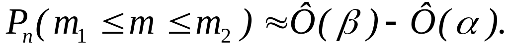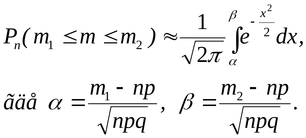 Если вероятность наступления события А в каждом из п независимых испытаний постоянна и равна р (р отлична от нуля и единицы), а число п достаточно велико, то вероятность того, что событие А в таких испытаниях наступит не менее т1 раз и не более т2 раз, вычисляется приближенно по формуле