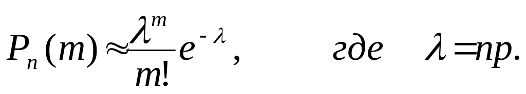 Если вероятность появления события А в каждом из n независимых испытаний мала, а число испытаний п достаточно велико, то вероятность того, что событие А наступит ровно m раз, вычисляется приближенно по формуле