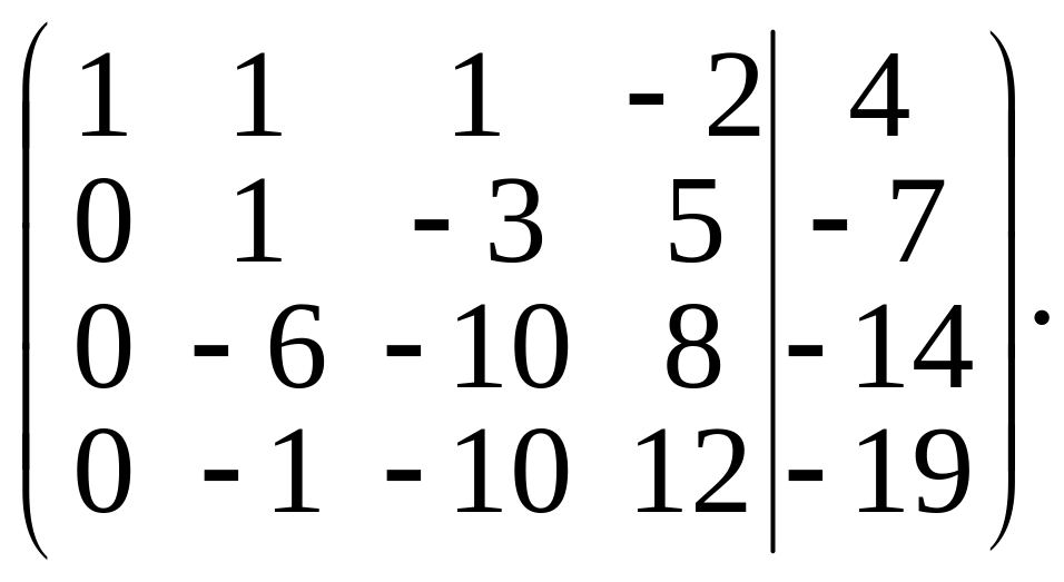 Умножив элементы первой строки последовательно на –2, –4 и –5. Полученные результаты прибавим соответственно к элементам второй, третьей и четвертой строк. Получим матрицу