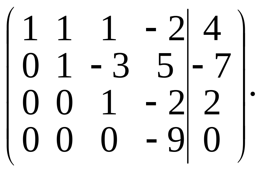 Элементы третьей строки разделим на –2 и затем элементы четвертой строки прибавим к элементам третьей строки. Получим матрицу
