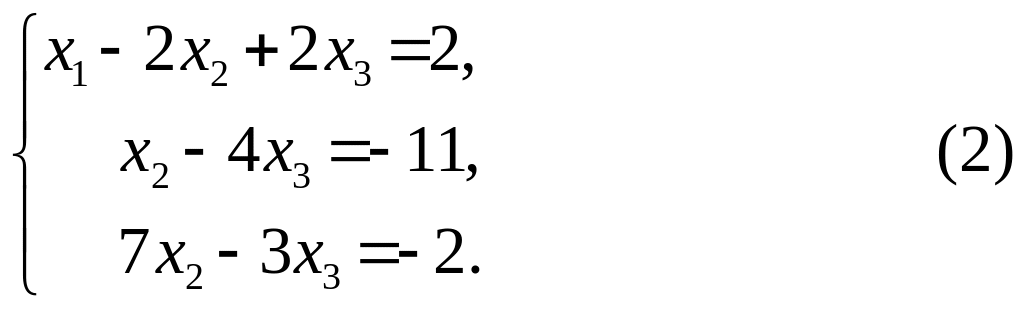 Теперь исключим из третьего уравнения системы (2) переменную х2. Для этого обе части второго уравнения этой системы умножим на (-7) и результаты прибавим к третьему уравнению. В результате получим систему