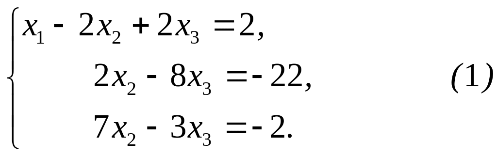 Решение. а) Исключим из последних двух уравнений х1. Для этого умножим первое уравнение на (–5) и результаты прибавим соответственно ко второму уравнению, затем обе части первого уравнения умножим на (–3) и результаты прибавим к третьему уравнению. В результате получим систему, эквивалентную данной: