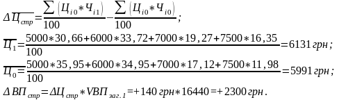 Потім, помноживши отриманий результат на загальний фактичний обсяг виробництва продукції в умовно-натуральному вираженні, отримаємо зміни обсягу товарної продукції у вартісному вираженні: