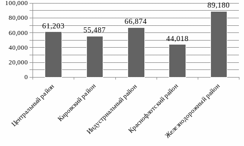 Высокие цены Центрального района обусловлены малым предложением объектов и высоким уровнем спроса на объекты, находящиеся в данном районе. В Железнодорожном и Индустриальном районах средние цены незначительно отличаются друг от друга. Наиболее низкая средняя стоимость одного квадратного метра установилась в Краснофлотском районе. Наиболее перспективным для покупки, при отсутствии других определяющих признаков, объекта является Железнодорожный район, так как имеет хорошую транспортную развязку и находится рядом с центром города.