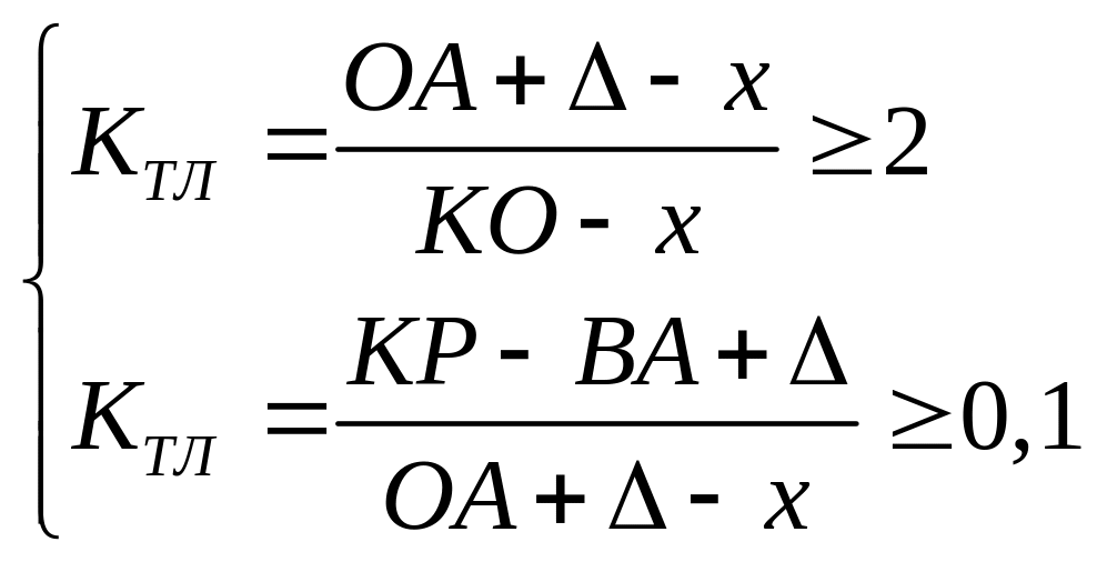 ВР в объеме Δ основных средств и других внеоборотных активов направляется на частичное погашение в объеме х краткосрочных обязательств и восполнение в объеме Δ-х недостатка оборотных средств. Новая структура, полученная от применения этой схемы должна удовлетворять условиям платежеспособности.