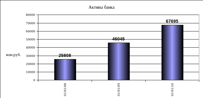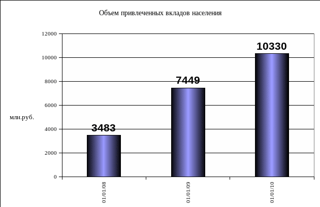 В 2010 году банк значительно активизировал работу по привлечению вкладов населения, в результате общая сумма вкладов на 01.01.10 г. увеличилась на 2881 млн.руб. и составила 10330 млн.руб., темп роста 2010 г. по отношению к 2009 г. составил 196,5% (табл. 5, рис. 9).