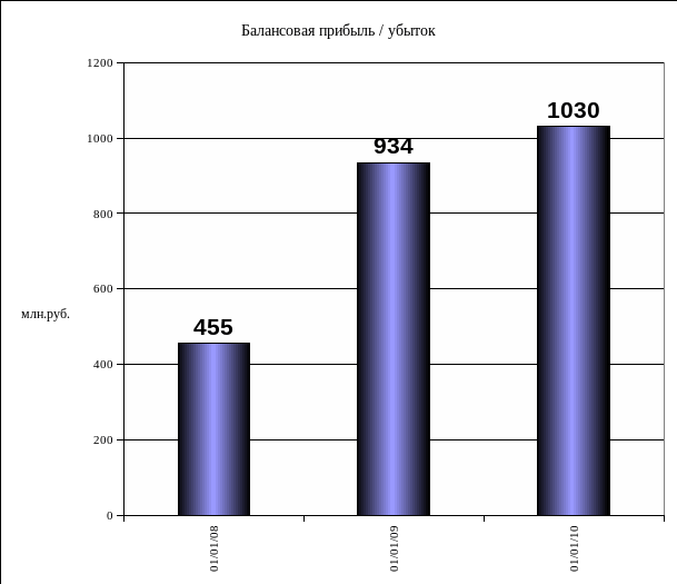Балансовая прибыль за последние три года стабильно увеличивалась и за 2010 год выросла на 96 млн.руб. составив 1030 млн.руб. на 01.09.2010 г. (табл. 2, рис. 3). Темп роста 2010 г. по отношению к 2009 г. составил 126,4%.