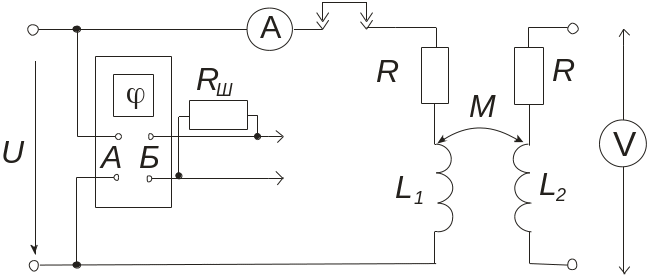 Скласти електричне коло (рис.23.1) для визначення власних параметрів котушок та взаємної індуктивності М.