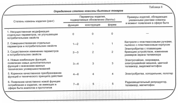 Представленная выше таблица позволяет определить степень новизны анализируемого изделия по сумме баллов, которую оно может получить. Для этого, прежде всего, определяют положение анализируемого образца в графе «степень новизны» и устанавливают балл, характеризующий функциональную новизну изделия, под которой понимается его потребительская функция, включая ее эстетический аспект. Новизна потребительских свойств изделия является, на наш взгляд, ведущим критерием качества любого бытового изделия. Так, электроутюг с увлажнителем, получив четвертый ранг новизны, в графе «функция» имеет 3—4 балла, в графах «конструкция» и «форма» — 6 баллов, а всего — 9—10 баллов. Фотоаппарат должен быть отнесен к высшему, шестому рангу, так как функция репродуцирования фотоизображений не имела в сфере быта каких-либо прототипов, если не считать профессиональной работы художников.
