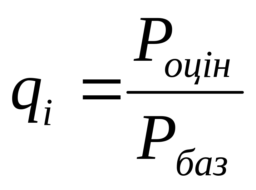 Одиничні показники (qi) визначають за кожним параметром як відсоткове відношення величини даного параметра оцінюваного виробу (Роцін) до величини того самого параметра базового виробу (Рбаз), який найкраще задовольняє потребу споживача.