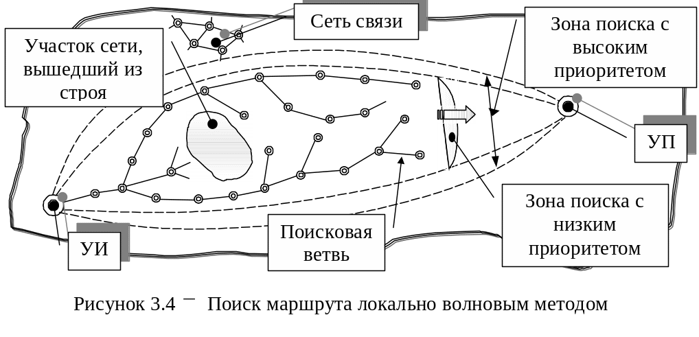 Локально волновой метод маршрутизации состоит в том, что для нахождения кратчайшего маршрута в сети между парой узлов из УИ организуется волновой поиск, но не во всех направлениях, а лишь в сторону УП. Волна поиска при этом распространяется в некоторой зоне в виде полосы, охватывающей пару соединяемых узлов (Рисунок 3.4). Ширина и форма полосы в зависимости от приоритета абонента может устанавливаться в заданных пределах. На рисунке 3.4 показан локально волновой поиск на сети от УИ к УП в некоторый момент времени, соответствующий примерно половине пути между парой узлов. Из рисунка видно, что поисковая волна это подвижная узкая зона, все узлы в пределах которой охвачены процессом волнового поиска. По мере продвижения к УП волна оставляет за собой ТПС, исходящие из начального узла.