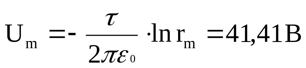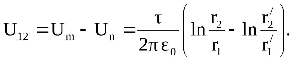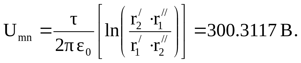 В условии задачи задана не линейная плотность зарядов, а разность потенциалов между проводами (разность потенциалов между точками m и n). Поэтому, прежде всего, следует определить линейную плотность зарядов . Для этого используем выражение для потенциалов, которое также приведено в предыдущем примере