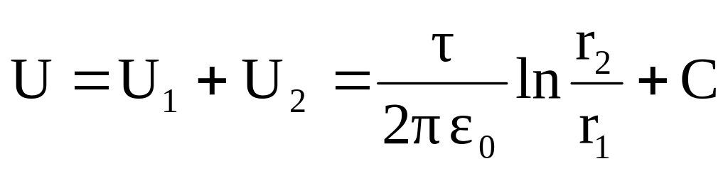 Потенциал поля в любой точке М определяется также, как сумма потенциалов поля от одного и другого провода
