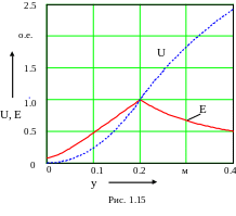 График изменения потенциала вдоль радиуса также в относительных единицах показан на рис. 1.4. За базисное значение потенциала принято значение потенциала на поверхности шара Ub = 35.5кВ.