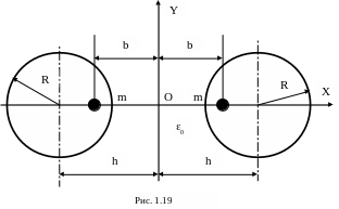 Пример 10. Два одинаковых бесконечно длинных проводящих цилиндра расположены в воздухе. Радиус цилиндров R=0.04 м, расстояние между геометрическими осями 2h=0.12 м (рис. 1.19).