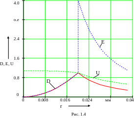 Графики изменения напряженности поля и вектора электрического смещения представлены на рис. 1.4. Значения напряженности поля и вектора электрического смещения даны в относительных единицах. За базисные значения приняты значения этих величин на поверхности шара, которые для заданных исходных данных соответственно равны Erb = 4,435·105В/м; Drb = 1,571·10-5Кл/м2.
