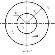 Пример 3. Цилиндрический бесконечно длинный конденсатор заполнен двухслойным диэлектриком, относительные значения диэлектрической проницаемости слоев которого равны соответственно r1=2 и r2=4. Радиус внутренней жилы равен R1=1мм, внутренний радиус наружной обкладки - R3=4мм, радиус поверхности раздела слоев диэлектрика - R2=2мм (рис. 1.29). К обкладкам конденсатора приложено постоянное напряжение Uо = 100 В. Один из диэлектриков заряжен (внутренний). Объемная плотность заряда является функцией расстояния r от оси конденсатора =аr2 (а=10).