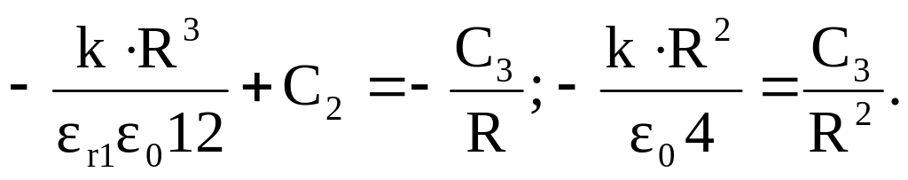 Оставшиеся две постоянные С2 и С3 определяем исходя из того, что на поверхности шара (r=R) равны между собой потенциалы и нормальные составляющие вектора электрического смещения
