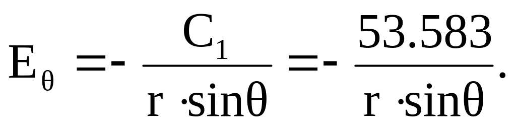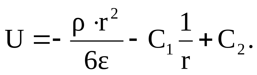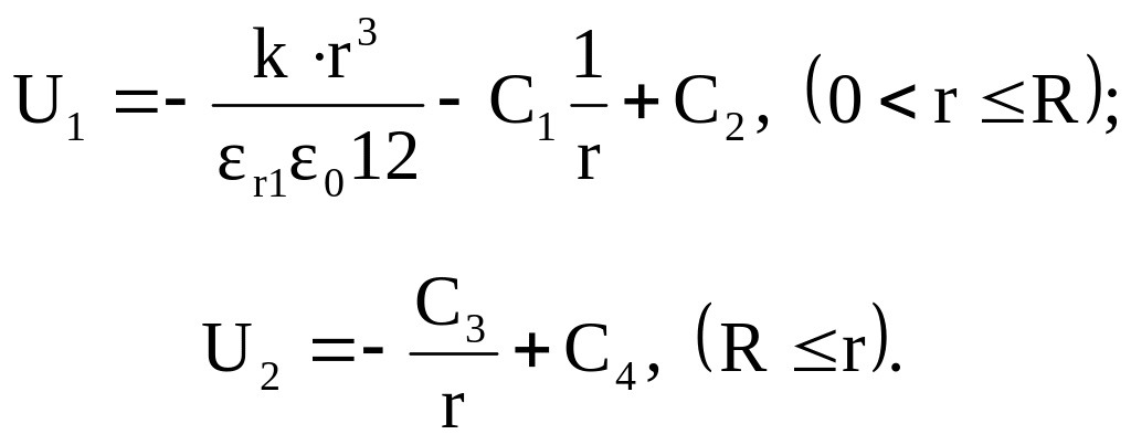 Постоянные интегрирования определяются из известных граничных условий и с помощью некоторых физических соображений. Так, потенциал в центре шара (r=0) имеет конечное значение, поэтому постоянную С1 необходимо принимать равной нулю (С1=0). Далее, принимая потенциал равный нулю в точке, лежащей в бесконечности (r=), получаем С4=0.