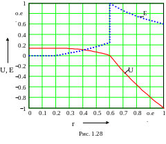 График изменения потенциала и напряженности электрического поля представлен на рис. 1.28. Все значения на графике даны в относительных единицах. За базисное значение напряженности поля принято ее значение на наружной поверхности цилиндра Eb=130.6кВ/м.
