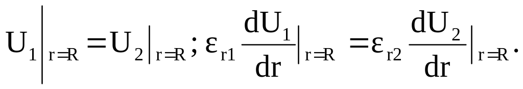 На границе раздела слоев диэлектриков (r=R2) равны между собой потенциалы и векторы электрического смещения (вектор электрического смещения имеет одну составляющую, направленную вдоль радиуса).