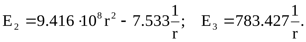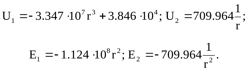 При решении задачи по расчету электрического поля в заданной области, эту область необходимо разбить на три подобласти. В первой из них (0rR1) поле отсутствует (Е=0). Во второй подобласти (R1rR2) электрический потенциал отвечает уравнению Пуассона (1.26), а в третьей (R2 r) - уравнению Лапласа (1.27), которые имеют решения (1.28) (при n=1,a=0.1) и (1.30).