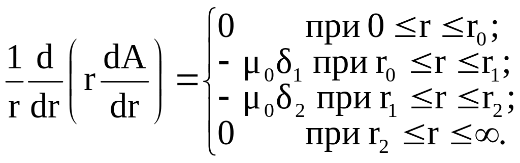 Для нахождения векторного потенциала необходимо для каждой из подобластей записать уравнение Пуассона (3.7) или Лапласа (3.8) и провести их совместное решение. Эти уравнения удобнее записывать в цилиндрической системе координат. При этом необходимо учитывать, что в данной задаче векторный потенциал имеет только одну составляющую, направленную по оси провода (по оси z) и эта составляющая зависит только от радиуса r. Раскрывая лапласиан в указанной системе координат, будем иметь: