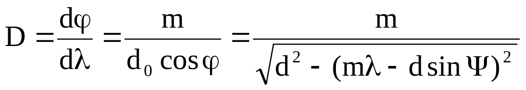 Дисперсия D характеризует угловое расстояние между двумя близкими спектральными линиями (например, между желтыми линиями излучения паров ртути). Используя условие главного дифракционного максимума (8.7) для D, получим:
