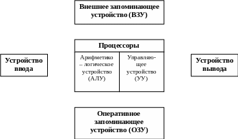 Джон фон Нейман не только выдвинул основополагающие принципы логического устройства ЭВМ, но и предложил ее структуру (схема 1), которая воспроизводилась в течение первых двух поколений ЭВМ. Основными блоками по Нейману являются устройство управления (УУ) и арифметико-логическое устройство (АЛУ), обычно объединяемые в центральный процессор, в который также входит набор регистров общего назначения (РОН) – для промежуточного хранения информации в процессе ее обработки; память, внешняя память, устройства ввода и вывода. Следует отметить, что внешняя память отличается от устройств ввода и вывода тем, что данные в нее заносятся в виде, удобном компьютеру, но недоступном для непосредственного восприятия человеком.