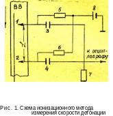 Перед проведением опыта конденсаторы заряжаются от источника напряжения. Пусть детонация распространяется сверху вниз. При замыкании промежутка 1 конденсатор 3 начнет разряжаться через сопротивление 7 и промежуток 1, в цепи возникнет импульс тока. Через некоторое время замкнется промежуток 2, начнется разрядка конденсатора 4 и возникнет второй импульс тока.