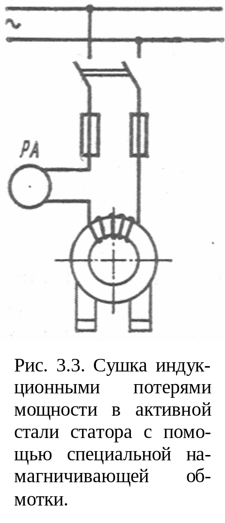 Этот метод непригоден для сушки машин мощностью менее 150…220 кВт, так как вследствие малого сечения активной стали, требуется очень большое количество витков.