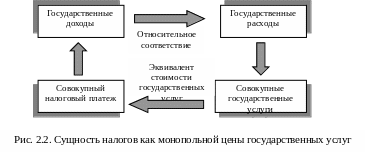 В их представлении, налоги в макроэкономическом контексте являют собой денежное выражение стоимости совокупных общественных благ, монопольно производимых государством. Под макроэкономическим контекстом здесь следует понимать не какой-либо налог отдельного индивида, а совокупный налоговый платеж общества своему государству. Невооруженным глазом видно, что в таком обосновании сущности налогов заложен фундамент эквивалентного и возвратного характера налоговых отношений, который проявляется не в индивидуальном акте его уплаты, а лишь с позиций всего общества. Данный подход явился крайне плодотворным и позволил опровергнуть положения классиков политэкономии о потерянной ценности для общества совокупного налогового платежа. Ценность в данном случае не теряется, она приобретает форму покупки и потребления обществом государственных услуг, при этом государство выступает как специфичный хозяйствующий субъект, которое имеет свое государственное хозяйство и свой «расчетный счет» – бюджет, учитывающий все доходы и расходы этого хозяйства (рис. 2.2).