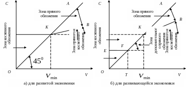 Теоретическое обоснование такому феномену дается в ряде работ, среди которых выделим оригинальный подход Р.Г. Гаджиева33, использовавшего в своей модели кейнсианский подход к анализу потребления и сбережения в масштабах национальной экономики. Суть закономерности, сформулированной Дж. Кейнсом, сводится к тому, что люди склонны увеличивать свое потребление с повышением дохода, но не в той мере, в какой растет доход. Графически модель Гаджиева представлена на рис. 3.4.