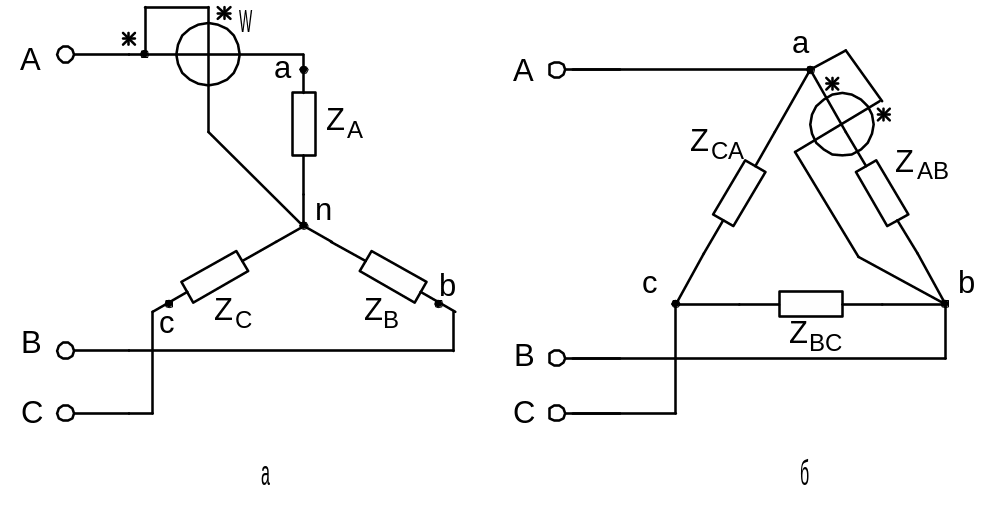 Чаще всего для измерения мощности в трехфазных трехпроводных цепях с несимметричной нагрузкой используют метод двух ваттметров, включенных в соответствии со схемой на рис.4.14. При этом активная мощность несимметричной трехфазной нагрузки равна алгебраической сумме (показания ваттметров могут быть отрицательными) показаний двух ваттметров.