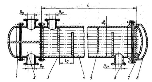 Рисунок 9 Кожухотрубчатый теплообменник с плавающей головкой: 1-крышка распределительной камеры; 2 - распределительная камера: 3 - кожух; 4-теплообменные трубы; 5- перегородка с сегментным вырезом; 6 - штуцер; 7 - крышка плавающей головки. 8 – крышка кожуха