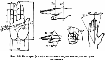 Размеры кисти руки человека и возможности ее движения учитываются при проектировании, например, рукояток инструментов и приспособлений, ручек, безопасных отверстий в решетках и других изделиях, с которыми соприкасается кисть руки. Приведены основные размеры кисти (верхние — для мужской, нижние — для женской руки). Отклонения от средних размеров кисти руки: максимальная длина кисти у мужчин 21 см (у женщин 20, 5 см), длина от запястья до середины кисти 10 (9,3) см. минимальная длина кисти 17 (15,9) см и длина от запястья до середины кисти 7,6 (7) см. Для отдельных пальцев руки приведены следующие максимальные значения (l—длина пальца, а — ширина пальца).