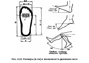 Пропорции ноги и пределы ее сгибания являются основополагающими при разработке ножных органов управления. Размерам и динамике ноги соответствует конструкция велосипеда. От длины ступни зависит глубина следа. Пространственные зоны под столом или пультами управления зависят от размеров и положения ног сидящего оператора. Высота локтя (над полом) определяет оптимальную высоту сиденья. Размеры ноги (в обуви и без нее) характерны для мужчин, рост которых составляет 175 см. На практике необходимо учитывать высоту каблуков мужской (2,5—3,0 см)и женской (3,0 — 7,0 см) обуви.