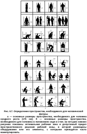 Рост человека колеблется в пределах порядка 150 — 200 см. Люди, рост которых превышает 200 см или не достигает 150 см, считаются либо очень высокими, либо низкорослыми. При определении зоны рабочего места на промышленном предприятии принимается во внимание в большинстве случаев средний (нормальный) рост человеческой фигуры. Для мужчины выбирают средний рост 175 см, для женщины — 165 (рис. 3, табл. 6.1). Такие значения чаще всего приводятся в отечественной и зарубежной литературе. Средние размеры тела (антропометрические данные) большинства мужчин и женщин стран Европейской части России, Средней и Западной Европы примерно одинаковы. Рост человека является исходным параметром при определении остальных характерных размеров тела. Путем сравнения размеров физически нормальных человеческих фигур найдено, что размеры отдельных частей тела у большинства людей пропорциональны их росту, например длина руки составляет 49% роста человека.