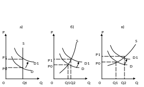 Допустим, что в силу определенных обстоятельств спрос на какой-то товар резко возрос. Так как предложение этого товара сразу возрасти не может, ситуация мгновенного равновесия будет характеризоваться лишь значительным повышением цены. Кривая предложения S представляет собой вертикальную линию с нулевой эластичностью, и сдвиг кривой спроса D в положение D1 увеличит равновесную цену с Р0 до P1 (рис. 2, а).