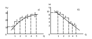 Рис. 4. Общая полезность (а) и предельная полезность (б).