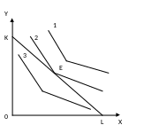 Каждая кривая (на рис. 7.6 это кривые 1, 2 и 3) соответствует определенному уровню потребления и благосостояния потребителей. Как видно, кривые безразличия 1 и 3 не соответствуют бюджетным возможностям потребителя, так как кривая 1 проходит ниже, а кривая 3 – выше бюджетной линии KL. При полном использовании бюджетных возможностей оптимальный уровень потребления и благосостояния – это точка E, где при данных ценах благ покупатель максимизирует их полезность.