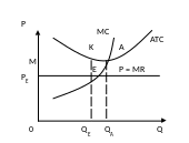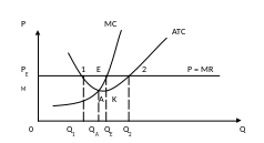 Вместе с тем равновесная ситуация не соответствует наиболее эффективной комбинации ресурсов. Производство осуществляется в данном случае не при самых низких издержках на единицу продукции. Средние издержки будут минимальными в точке А, при этом средняя прибыль окажется максимальной. Однако производителя интересует максимум не единичной, а совокупной прибыли. Поэтому ему выгодно увеличить производство с QA до QE.