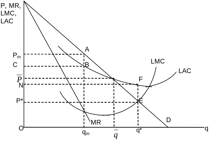В отсутствие государственного ценового контроля естественный монополист, как и любой другой, выбирает выпуск qm, при котором предельный доход равен предельным затратам, и устанавливает монопольно высокую цену – Pm. Поскольку цена превышает долгосрочные средние затраты при данном выпуске (равные отрезку OC), монополист получает экономическую прибыль (сверхприбыль), равную площади прямоугольника CPmAB. В результате общество страдает от действий монополиста, ибо цена завышена, а выпуск меньше общественно эффективного (q*).