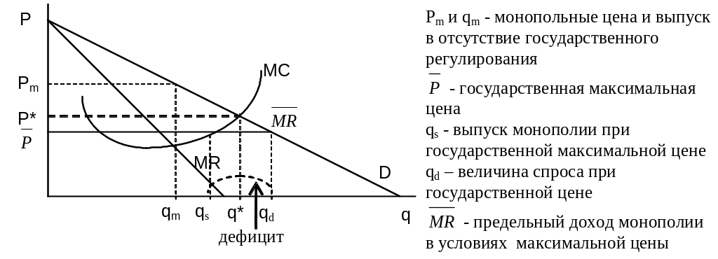 Наилучший результат государство могло бы получить, установив цену на уровне точке пересечения кривых спроса и предельных затрат (P*). При этом выпуск монополиста будет максимален и равен общественно-эффективному (q*), а дефицит исчезнет.