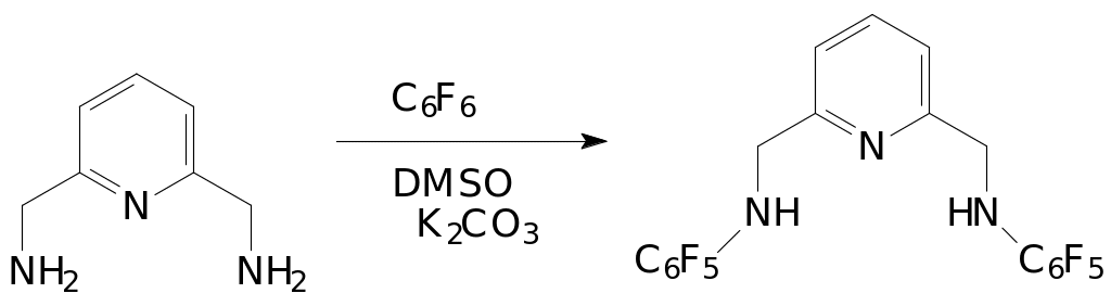 Для синтеза 2,6-бис(ариламинометил)пиридинов, где арильная группа имеет сильные электроноакцепторные заместители, описан [21] метод синтеза, основанный на нуклеофильном ароматическом замещении. Реагентами в данном случае являются 2,6–бис(аминометил)пиридин и гексафторбензол. Реакцию проводят в ДМСО при 80°С в присутствии карбоната калия.