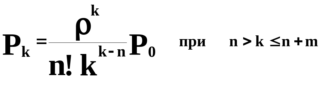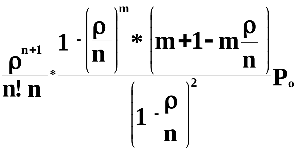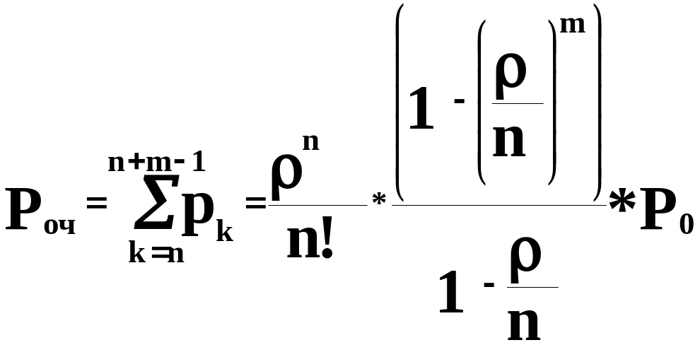 ) Образование очереди возможно только тогда, когда вновь поступившая заявка застанет на обработке в системе не менее n требований на обслуживание8, т.е когда в СМО будет находиться n, n+1, n+2,…n+m-1 требований на обслуживание. Учитывая то, что заявки в СМО поступают независмо друг от друга, вероятность того, что все каналы обслуживания будут заняты равна сумме вероятностей Рn, Pn+1, Pn+2,…Pn+m-1.