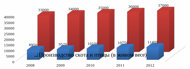 Динамика объемов выпускаемой продукции в сфере животноводства на 2008-2012 годы, тыс. тонн